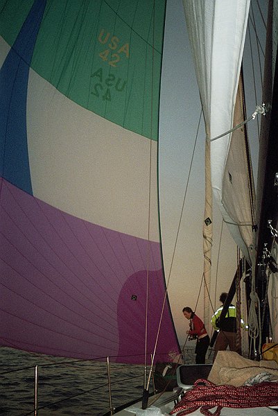 First big off-shore race – 555 miles from St. Pete to Isla de Mujeres, Mexico. With a crew of nine the spinnaker was no challenge on terrific full moon sail.