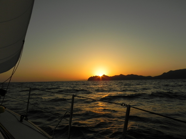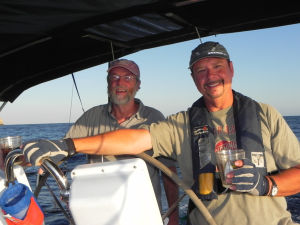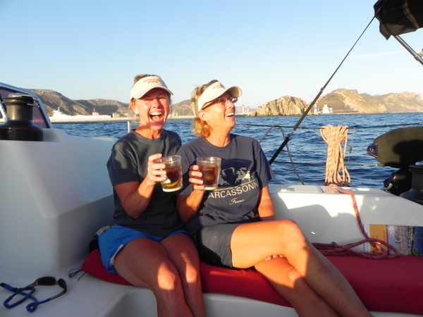 The Grateful Red spent a month at the Valencia marina having both repairs and upgrades. The key repair – Pat the refrigerator technician flew in from California to Valencia plus Ken hired a local refrigeration repair man. The result – the Grateful Red again has cold beer. Took four days to repair the refrig compressor. After a month Ken and Kristine returned to be joined with George and Teri for a Spanish coastal cruise – looking for a Spanish bull fight that never was to be found. The first leg was an overnight to Puerto de Santa Pola. While the beer was cold the instruments/auto pilot continued to have issues. With such a “crack” crew the spinnaker was deployed on the next leg a sail to Port Cartagena. Cartagena is also a NATO naval port and ………. on our way out a NATO submarine cruised …. and I mean cruised at about 20 knots ….. past us. Quite a sight. Another over night to Almerimar along the Spanish Costa del Sol coast. The Costa del Sol has miles and miles of over built and empty condos. With winds variable to none the Grateful Red motored to the port of Benalmadera where Teri and George took a cab to the Malga airport tp return and ….. the new crew of Ron, Niki and John arrived. Ron’s planning was terrific arriving in time to have a leaving and arriving crew party dinner in Benalmadera.